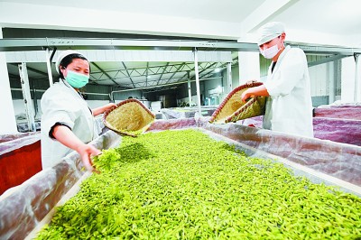 贵州省遵义市正安县的工人在摊晾白茶茶青。 新华社发